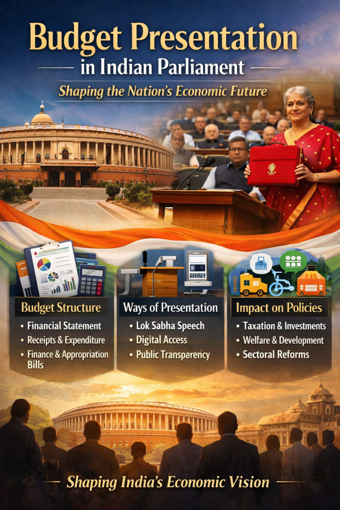 The Budget is traditionally presented in the Lok Sabha, often in a speech that highlights the government’s economic strategy, reforms, and welfare measures. Over time, it has evolved with digital innovations, making detailed documents accessible to the public for transparency and scrutiny.